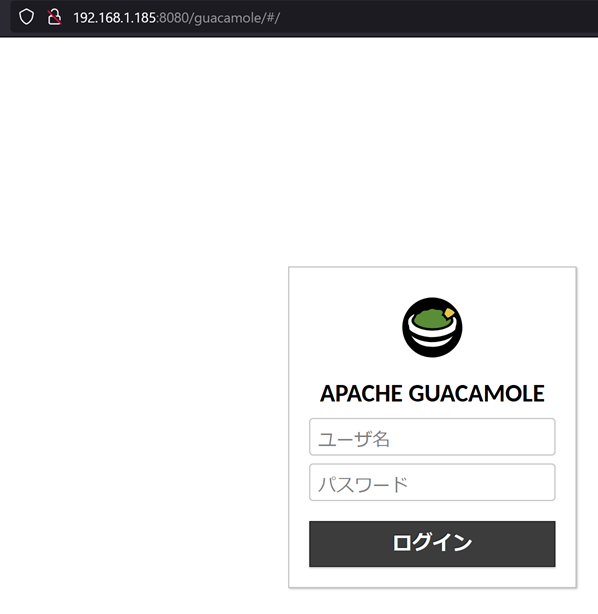 http://GuacamoleのIPアドレス:8080/guacamole/にアクセスします。
